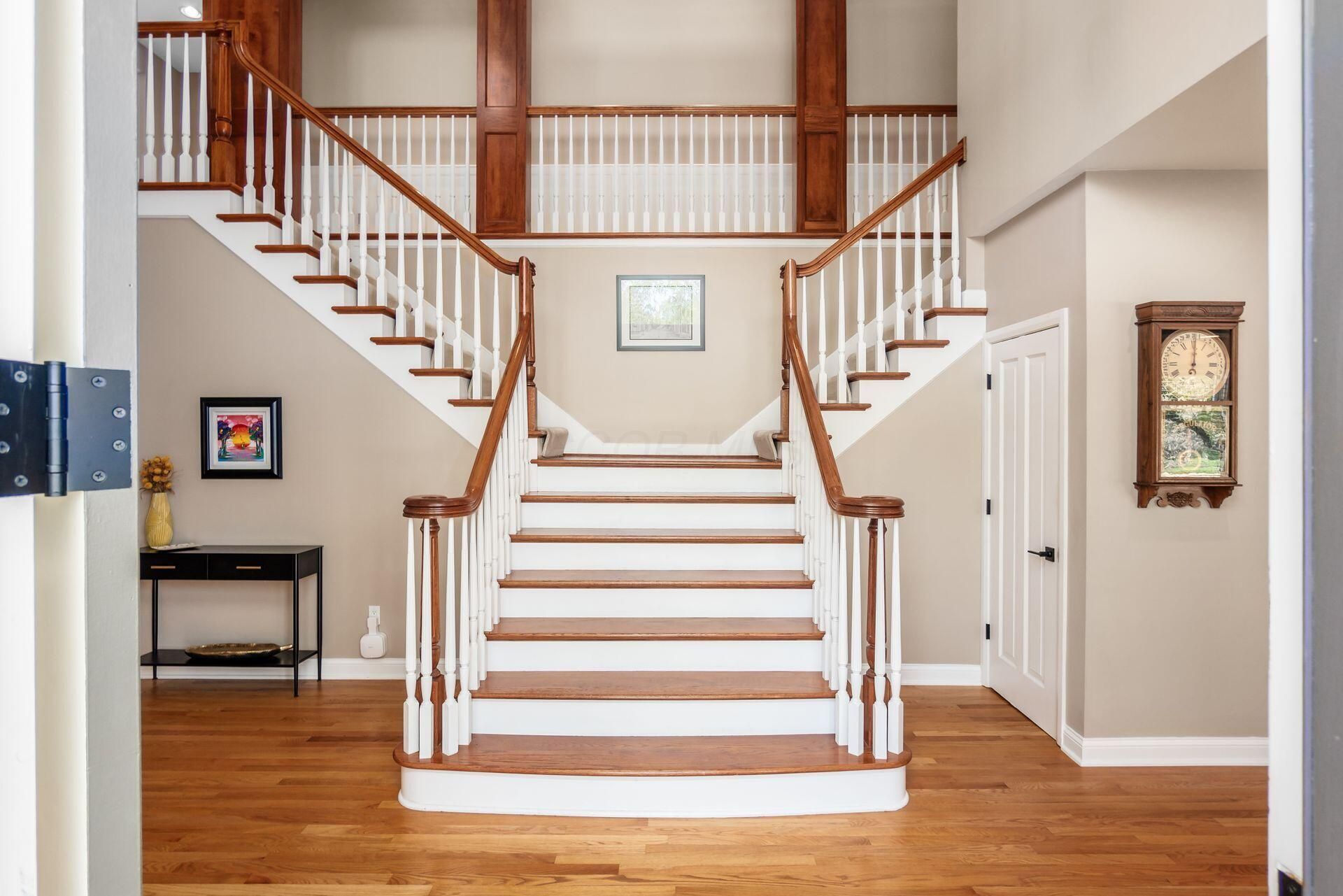 Fantastic end of cul de sac location! Step inside the entry to a stunning two story foyer with a bridal staircase. Sunlight pours into the formal living and dining rooms, showcasing the gorgeous hardwood floors that continue into the large island kitchen. The kitchen is beautifully appointed with stainless steel appliances, including a double oven, gas cooktop, microwave, ice maker and Sub-Zero refrigerator, complemented by quartz countertops, a spacious island, and a dual-sided fireplace shared with the vaulted great room. The private den features French doors and built-ins, plus a convenient half bath. Upstairs, you'll find four bedrooms, three full baths, and a convenient laundry room. The owner's suite is a true retreat with a gas fireplace, vaulted ceiling, & a luxurious en-suite bath with dual quartz vanities, soaking tub, & separate shower. The lower level has new LVP flooring & fresh paint & offers a bar, large workshop (including all outlets w/20 amp service & a dust collection system), expansive recreation space, half bath, & extensive storage. Nature lovers paradise in the private backyard plus two decks, a patio, and plenty of room to relax or play! This one is gorgeous! Interior photos will be posted 4/23!